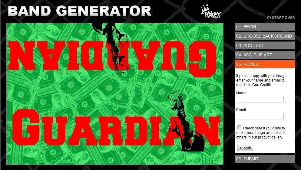 One graffiti generator you can make the choice to create an online graffiti is Gun-Graffiti (http://www.gun-graffiti.com). Then how do I make it, first you must first visit the site of the Gun graffiti. If it is then you will be faced with the choice before you make your graffiti like.If it is then you will be faced with the choice before you make your graffiti like.
